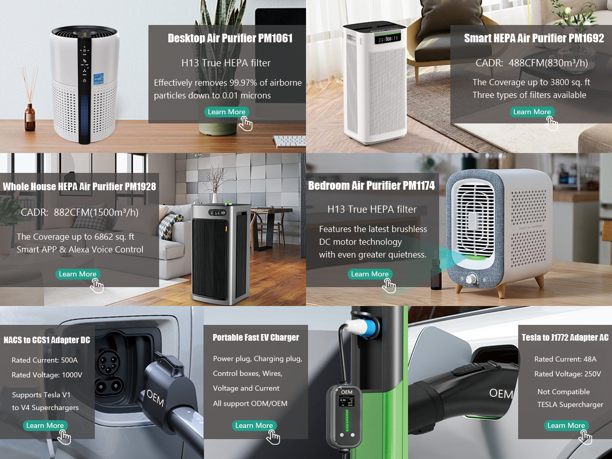 Productos principales:Purificador de aire, cargador EV, adaptador de cargador EV, estación de carga EV, detector de monóxido de carbono